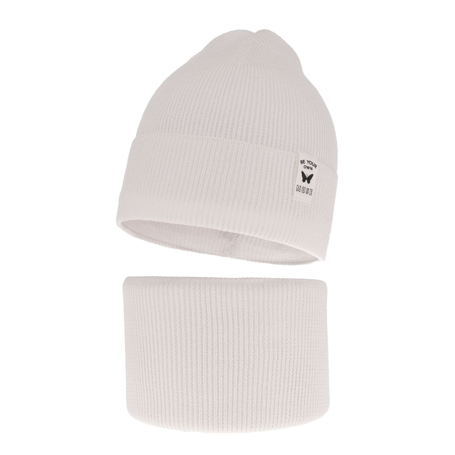 Pige efterår/forår sæt (hue og halsvarmer) Leonita udmærker sig med omhyggeligt designede detaljer. Det charmerende sommerfuglmotiv på applikationen fanger øjet og tilføjer et feminint præg. Det moderne ribstrik mønster giver sættet elegance og sikrer, at det passer perfekt sammen med forskellige outfits - fra hverdagsbrug til mere festlige lejligheder.