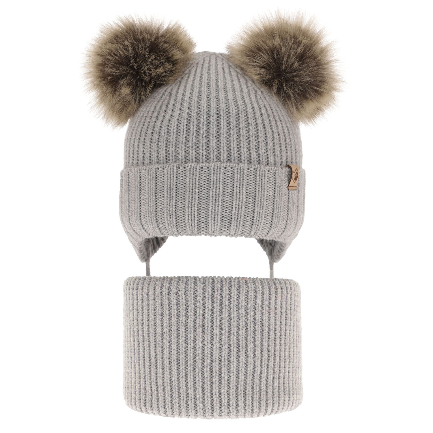 Den unikke hue med to pomponer fanger blikket med sit søde udseende og den praktiske løsning i form af bindebånd, der sikrer en stabil placering på hovedet under vinterleg. Hele sættet kompletteres med et stilfuldt mærke, der giver vintersættet et eksklusivt præg.